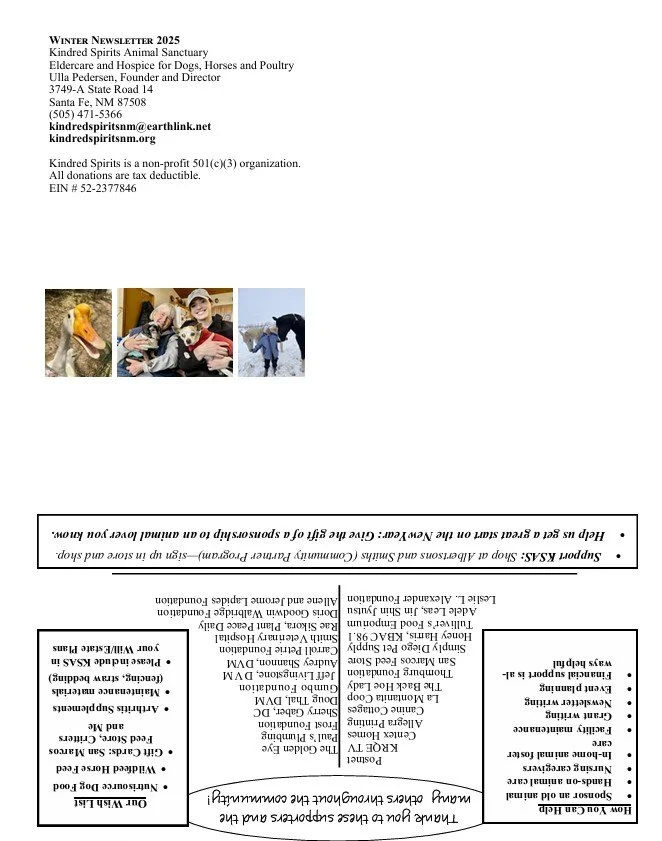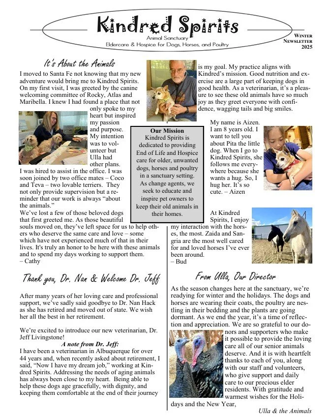 Thanks to the support of each and every one of you, Kindred Spirits has been able to help hundreds of older unwanted dogs, horses, and poultry and has been spreading the word about our Wellness Care Program and our in-home model of animal hospice care further with each year.